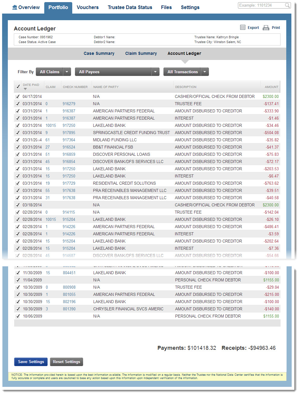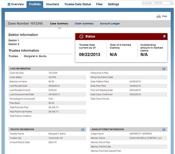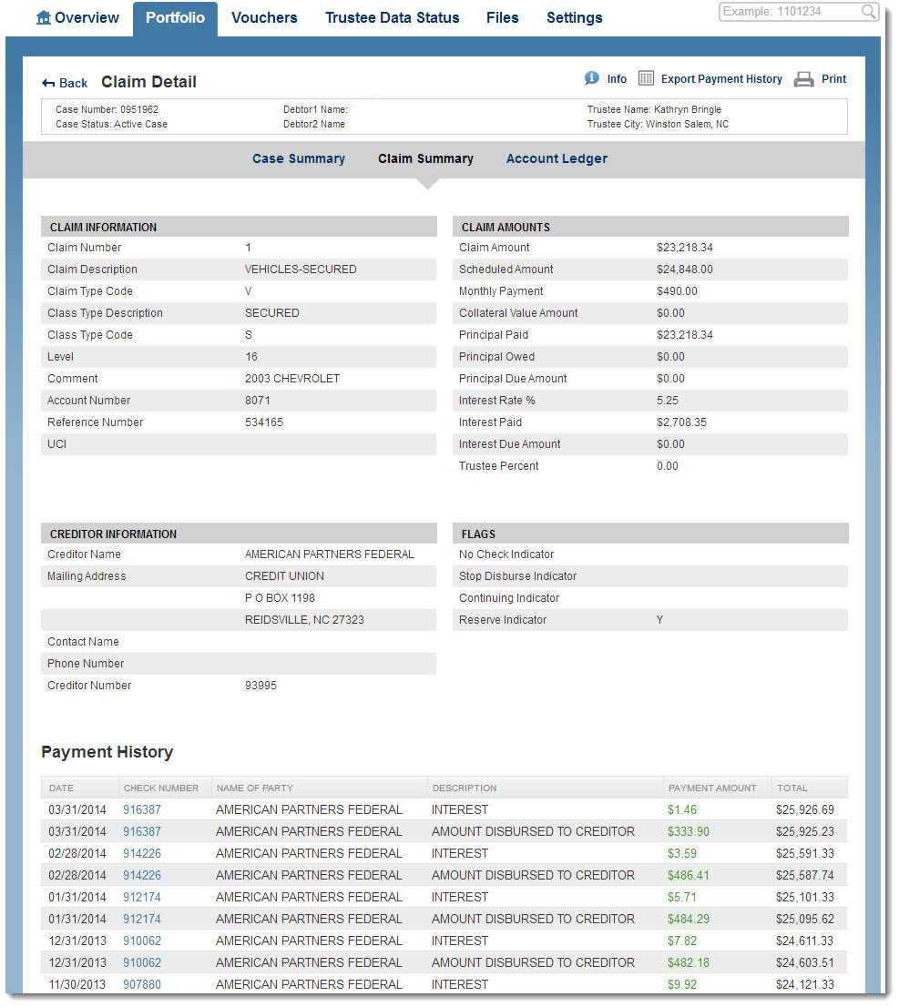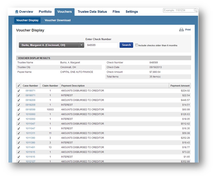 The Voucher page displays all the details about a check from the Trustee...